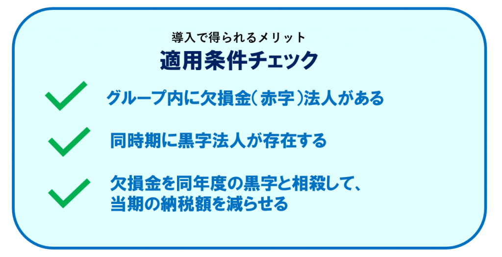 赤字が発生しているが将来的に黒字が見込める企業を買収した場合、買収直後の赤字についてグループ通算制度内で他のグループ企業の黒字と通算させることが可能です。