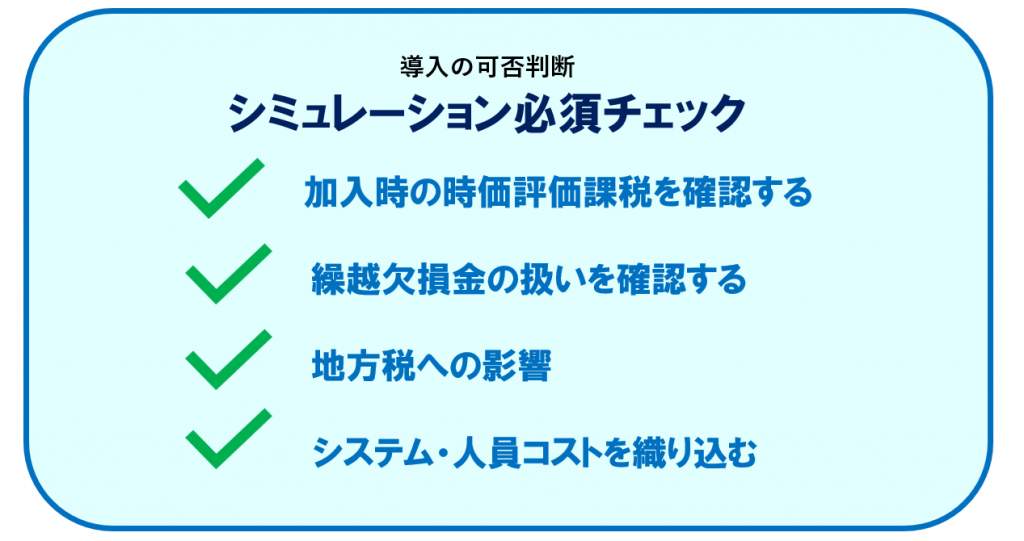 グループ通算制度は原則として一度開始すると取りやめが難しいため、加入時の時価評価課税、繰越欠損金の扱い、地方税影響、システム・人員コストを含めた事前シミュレーションが必須です。税務申告だけでなく、金融機関や株主への報告スケジュール調整も必要になります。