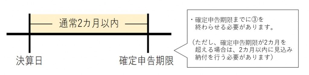 上の図のとおり、決算日から原則2ヵ月以内に確定申告をして税金を納付する必要があるため、余裕をもった申告をおすすめします。