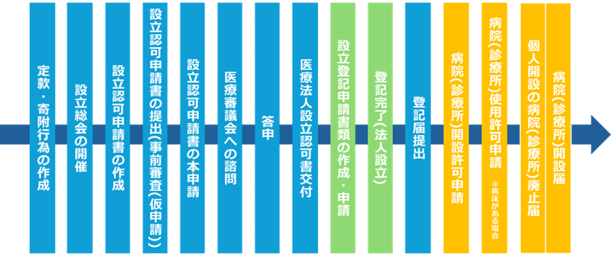 医療法人設立手続きの主な流れは下記の通りです。医療法人設立には都道府県だけでなく、法務局・所轄保健所等への手続きも必要になり煩雑なため、行政書士に依頼するケースも少なくありません。