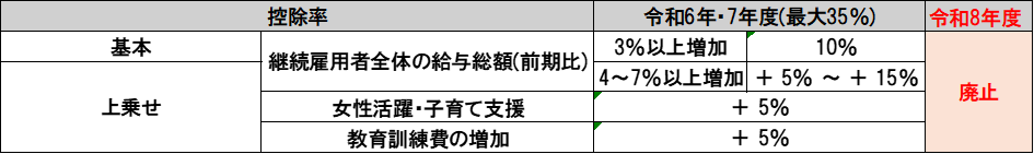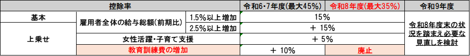 ③ 中小企業向け:令和8年度より教育訓練費の上乗せ措置が廃止となり、令和9年度以降の対応は未定