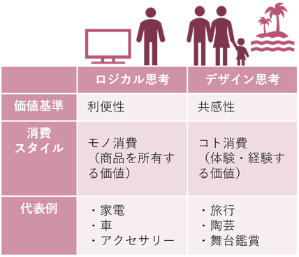 このような消費スタイルの変化から、デザイン思考が創出されました。デザイン思考とは、消費者の潜在ニーズを重視し、課題解決する思考法です。「どのような体験ができるか」「どのような感情を得られるか」など、消費者の心を満たす共感性が価値基準とされています。