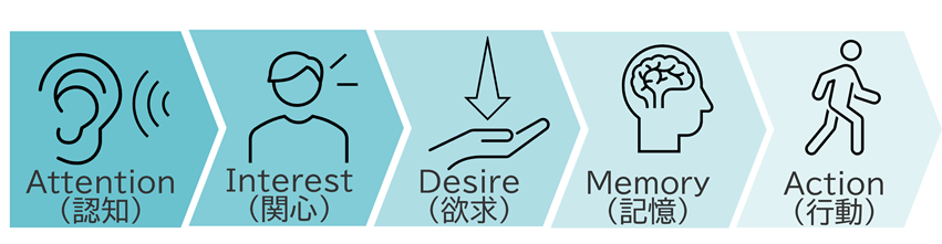 AIDMAモデルとは、消費者の購買行動を認知してから購入に至るまでを分類した、以下一連のプロセスです。営業活動における課題が、どのプロセスで発生しているかが明確になり、顧客の心理状態に沿う効率的なアプローチができます。
