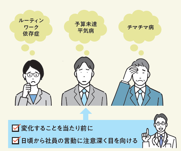 成人病とは上手く言い表したものですが、人間であれば偏った食事や運動不足、喫煙といった生活習慣の影響が大きい慢性疾患であり、様々な病気を引き起こすリスクを高める要因となるものです。自社が会社の成人病にかかっていないかを見極めるためには、まずは社員一人ひとりの発言や行動に注意深く目を向けることが必要です。
