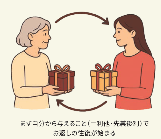 人間がつくる社会は、贈り物を受け取ってお返しをするという活動によって常に動き続けているのであり、人間が他人と共生するための時代を超えたルールなのです。そしてこのルールの下では、お返しを得るためにはまず自分が他人に与えることから始めなければいけません。