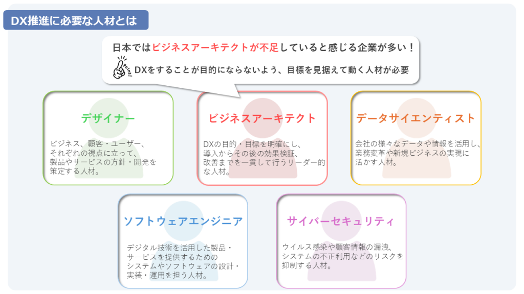 以上のように、DXを推進するには様々な能力が必要になります。各担当が個別で動くのではなく、課題を協業しながら一つずつクリアしていくのが理想です。IPAの「DX動向2025」によると、日本の企業ではDX全体をリードする「ビジネスアーキテクト」が不足していると感じている企業が多いという結果が出ています。