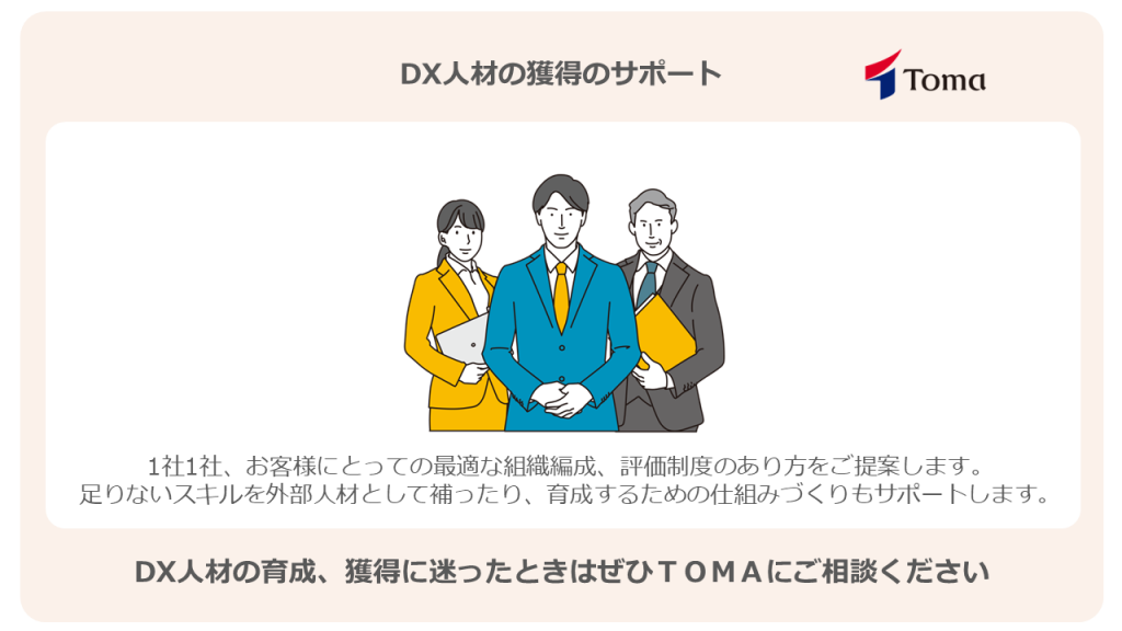 経済産業省が公表する「中堅・中小企業等向けDX推進の手引き2025」において、内製が難しい場合は外部企業のサポートを受けること、支援機関などによる伴奏支援の活用を推奨しています。そのため、DX人材の育成、獲得に迷ったときはぜひTOMAにご相談ください。