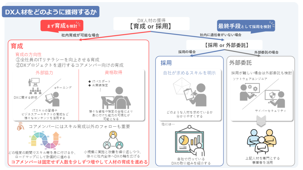 社員に適任者がいない場合は、採用を選択肢に入れます。採用では自社が求めるスキルを明示し、どんな人材を求めているかをわかりやすくすることが大事です。自社のDXの取り組みを紹介するのも良いでしょう。採用が難しい場合は【外部委託】という手段もあります。特に、ソフトウェアエンジニアやサイバーセキュリティといった人材は、それらを専門とする事業者もあります。