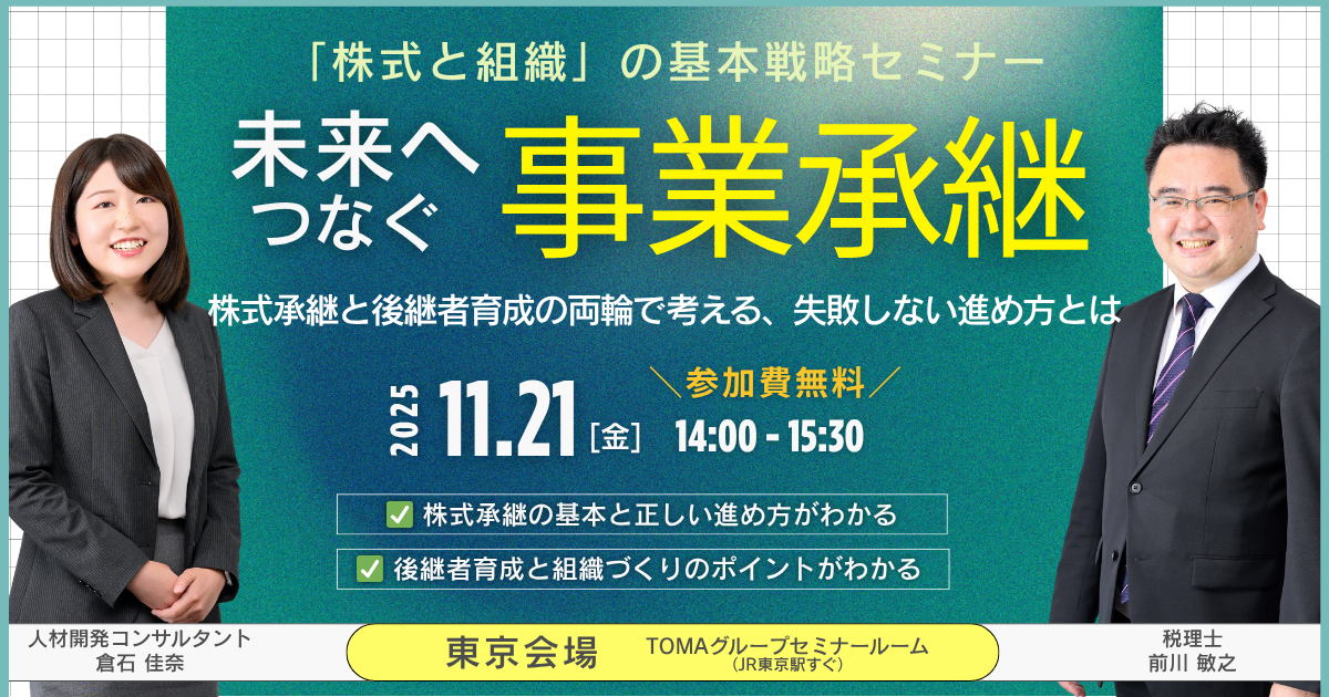未来へつなぐ事業承継~「株式と組織」の基本戦略セミナー~株式承継と後継者育成の両輪で考える、失敗しない進め方とは~