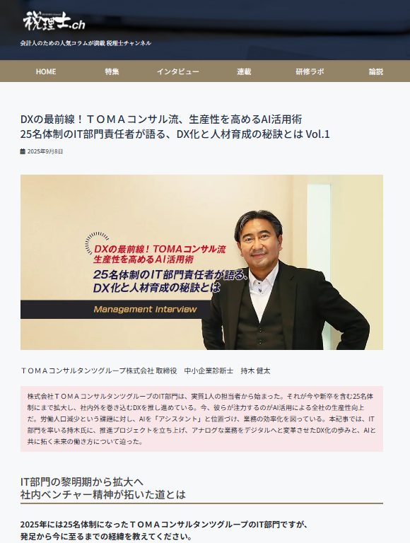 ビズアップ総研が運営する会計業界に特化した情報メディアサイト『税理士.ch』に取材協力しました。TOMAコンサルタンツグループのDX化の歩みと、AIと共に拓く未来の働き方について、取締役 中小企業診断士 持木健太のインタビュー記事が掲載されています。