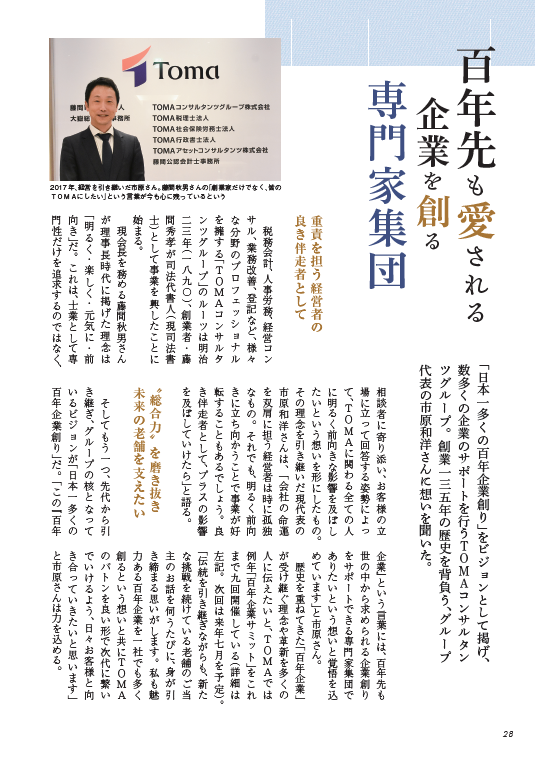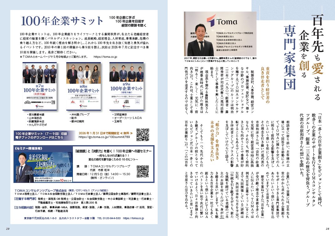 老舗企業・店舗や江戸の伝統・文化を紹介する月刊『江戸楽』12月号にて、TOMAコンサルタンツグループ株式会社 代表取締役社長 市原 和洋のインタビュー記事広告を掲出しました。「日本一多くの100年企業を創り続ける」というビジョンの下に開催している「100年企業サミット」も紹介しております。詳細は下記をご覧ください。