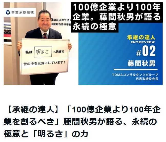 事業承継機構のnoteに、TOMAコンサルタンツグループ株式会社 代表取締役会長 藤間秋男のインタビューが掲載されました。