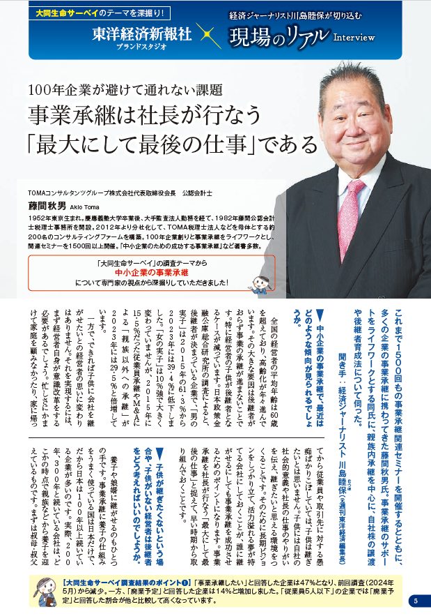 大同生命が発行する会報誌『one hour』2025年10月号に、TOMAコンサルタンツグループ株式会社 代表取締役会長 藤間秋男のインタビューが掲載されました。中小企業の事業承継について、専門家の視点から論及しております。詳細は下記をご覧ください。
