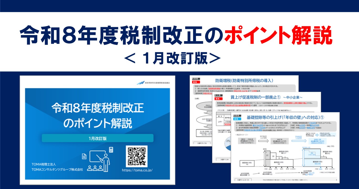 今回の改正で押さえておくべき主要な項目をピックアップした資料「令和8年度税制改正のポイント解説」<改訂版>をお届けします。改正内容の理解や今後の対応、さらに経営戦略の立案にお役立てください。事業承継 経営者・後継者向け 税務・会計・財務 人材開発・組織開発 業務改善・IT活用サービス 医療・介護・調剤薬局等支援
